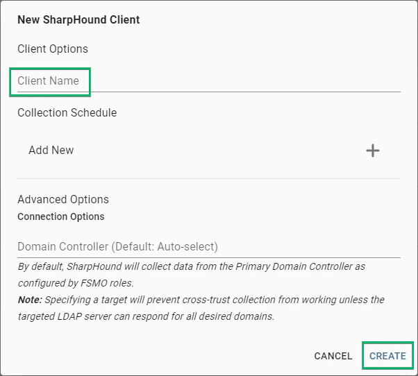 - In the pop-up window, for example named New SharpHound Enterprise Client, input the Client Name and click CREATE