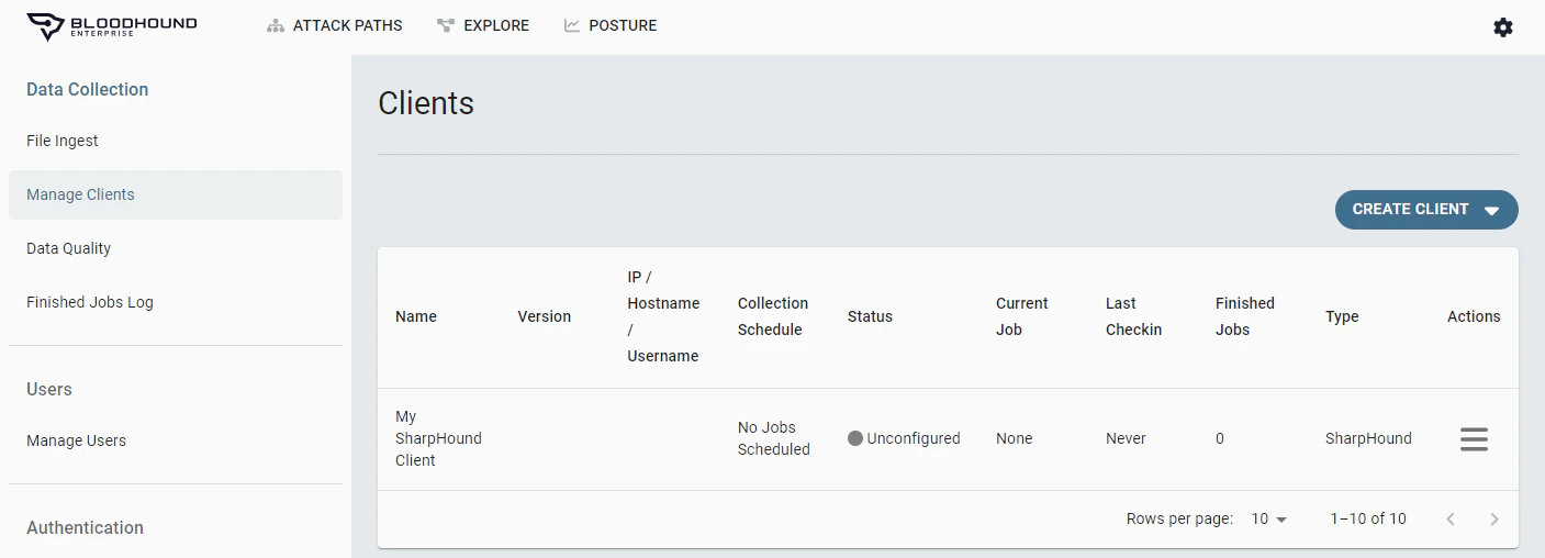 - On the right side, click Create Client and, from the drop-down, select one of the collector clients, for example Create SharpHound Client