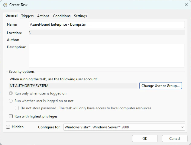 1. Best practices recommend naming tasks after their collector service and tenant to ensure clarity when reviewing multiple tasks across multiple collectors and/or tenants. In this example, AzureHound Enterprise is the collector, and the tenant referenced is Dumpster. In the Security options in the lower portion of the General tab, select the Change User or Group… button to run this task as SYSTEM. This ensures the scheduled task remains independent from user activity.