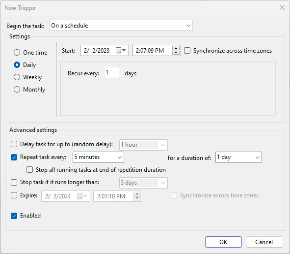 1. On the New Trigger screen, set the task to run Daily, repeating every 5 minutes for a duration of 1 day. This ensures the task restarts if an issue arises.