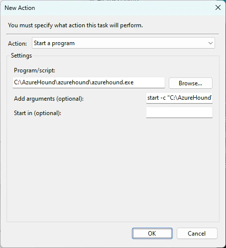 1. On the New Action window, select Start a program, then Browse… to the location of AzureHound with the config file for that Azure tenant. Modify the following argument to match the location of the appropriate config.json, then fill in the Add arguments (optional) field, and click OK.