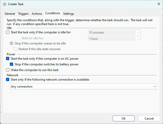 1. On the bottom of the Conditions tab, check the Start only if the following network connection is available: checkbox, and select Any connection.