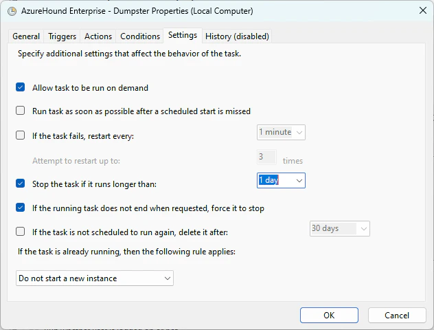 1. On the Settings tab, enable the Stop the task if it runs longer than 1 day setting, then select OK.