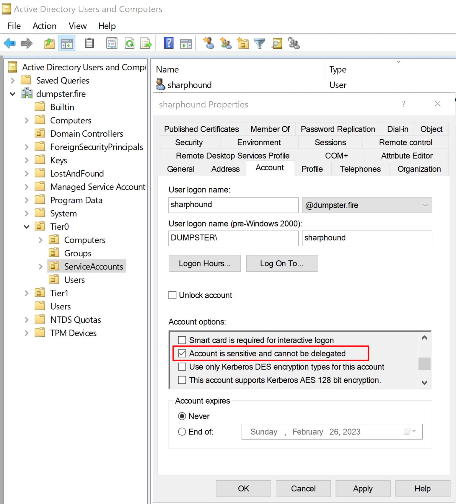 We recommend adding the SharpHound service account as a member of the Protected Users group. Protected Users is an AD security group designed to reduce credential exposure. Members of this group automatically have non-configurable protections applied to their accounts. Protected Users members cannot be delegated with Kerberos and cannot authenticate using NTLM, effectively remediating Kerberos delegation attacks, NTLM relay attacks, and NTLM cracking. However, Microsoft advises against adding service accounts to the group as authentication for the service account may fail. Our testing has shown that adding the SharpHound service account to Protected Users works if the SharpHound service account is a gMSA, but the SharpHound service crashes after four hours if it is a regular AD user.