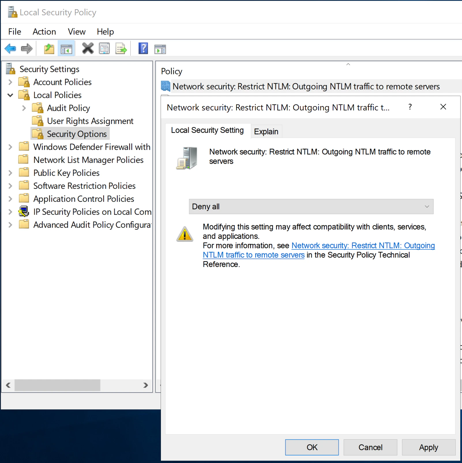 Outgoing NTLM can be denied entirely from the SharpHound server by configuring the security option Network security: Restrict NTLM: Outgoing NTLM traffic to remote servers to Deny All: